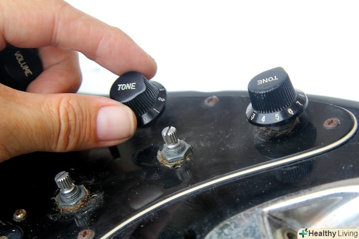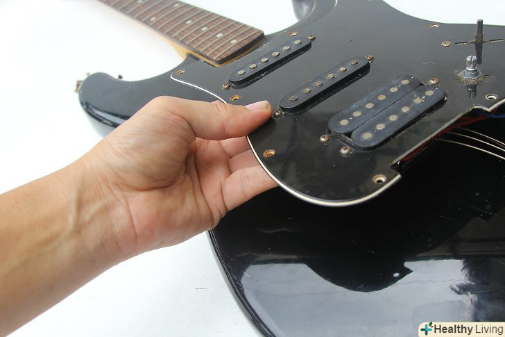Зніміть все, що ви не збираєтеся фарбувати.якщо потрібно, зніміть накладку і Звукознімачі, а також всі тумблери і регулятори гучності, які ви не плануєте перефарбовувати в обраний колір. Як правило, їх можна просто витягнути, а потім вставити назад.- Якщо в процесі знімання ви випадково зламаєте набалдашник, купіть новий в будь-якому гітарному або онлайн магазині, що продає комплектуючі для гітар, за умови, що гітара була стандартної моделі.