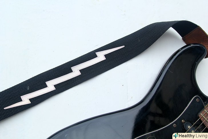 Дістаньте яскравий ремінь.це може бути шкіряний ремінь з психоделічним символом, з блискавками або з патронташем. Крутий ремінь може зробити такий же ефект для вашого сценічного образу і атмосфери, що і прикрашена гітара. Пошукайте в онлайн магазинах відповідний ремінь або подумайте про те, щоб виготовити його самому.- Відрегулюйте висоту ременя відповідно до виконуваного стилю музики. Тобто, опустіть його низько, якщо граєте в панк-групі і підійміть в самий верх, якщо граєте в інді-групі.