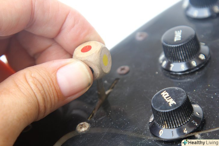 Прикрасьте тумблери.більшість електрогітар оснащені пластиковими тумблерами, які можна зняти і замінити на що-небудь химерне або прибрати зовсім для більш панківського або індустріального вигляду. Більшість тумблерів мають міцну металеву серцевину, яку можна використовувати саму по собі або прикрасити її чим завгодно.- Витягніть регулятор гучності на своїй гітарі і вставте замість нього гральну кістку з просвердленим отвором, а потім приклейте її до металевого стрижня. Крім того, ви також можете закріпити глиняні кульки, чоловічків з LEGO і пляшечки з-під ліків.