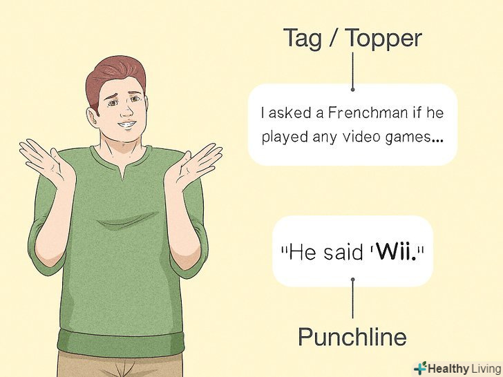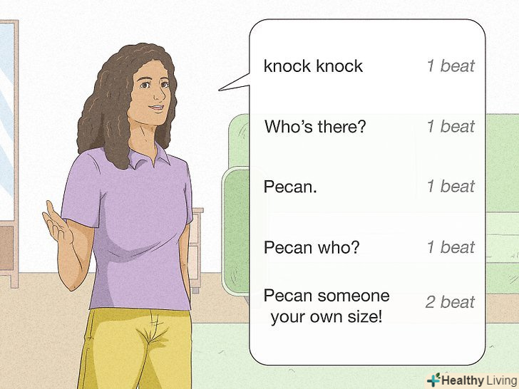 Зробіть паузу перед заключною фразою.додаткові секунди дозволять посилити напругу перед хвилею сміху.[9] це дозволить жарту завершитися вибухом реготу, а не просто парою смішків.- Існує думка, що жарт повинен будуватися за правилом Трійці, де завершальна фраза стає третьою реплікою в історії.[10] подібне правило обмежує оповідача і застосовується тільки до діалогів з трьох реплік.