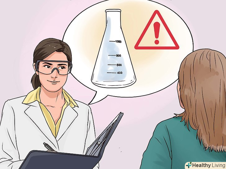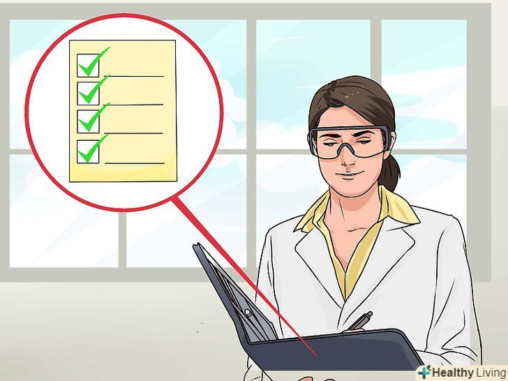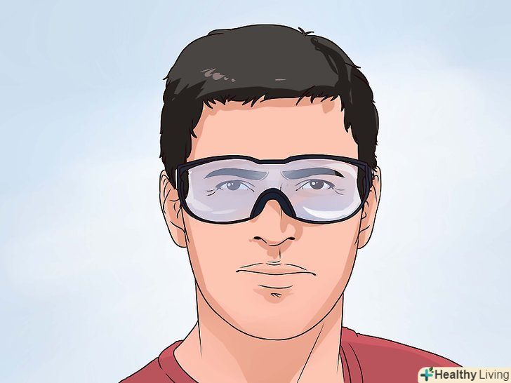 - Звичайні окуляри недостатньо захищають очі, так як бризки можуть проникнути збоку лінз або під ними. Одягніть поверх звичайних захисні окуляри. Можна також замовити захисні окуляри з потрібними Вам лінзами, якщо ви часто працюєте в хімічній лабораторії.