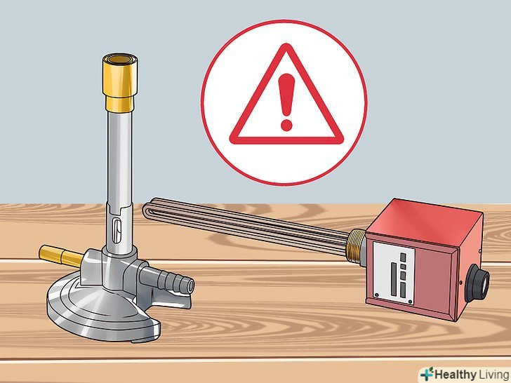 Слідкуйте за джерелами тепла.у всіх добре обладнаних хімічних лабораторіях є джерела тепла, наприклад пальник Бунзена або електрична плита, які потрібні для проведення різних експериментів. Ці джерела часто є причиною різних подій, від легких опіків через дотик до гарячого скляного посуду до загоряння одягу або волосся від пальника Бунзена.- Завжди будьте дуже обережні з джерелами тепла і відкритого вогню. Не тримайте руки над ними, інакше у вас може спалахнути рукав, і ви обпечете руку.