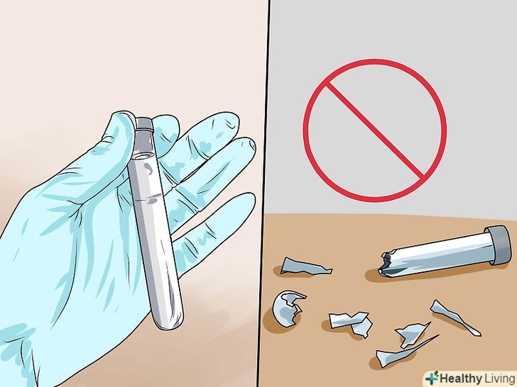Будьте обережні, щоб не розбити скляний посуд.часто неприємні події трапляються через те, що хтось забуває змочити скляну мензурку перед тим, як закрити її кришкою або пробкою, і в результаті вона розколюється на гострі осколки. Можна також випадково впустити скляний посуд, особливо якщо на вас незручні рукавички.- Пересувайтеся по лабораторії уважно і не поспішаючи, щоб не розбити скляний посуд і не порізатися або отримати інші пошкодження. Якщо ви випадково розіб'єте що-небудь, будьте обережні, коли прибираєте за собою, — гострими осколками легко порізатися, навіть якщо ви в захисних рукавичках.