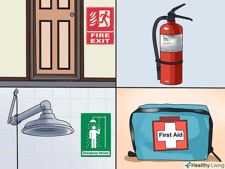 Ознайомтеся з лабораторією, перш ніж приступати до роботи.хімічні лабораторії можуть мати різне планування, і з незвички буває важко знайти те, що може знадобитися в надзвичайній ситуації. Навіть якщо ви допомагаєте кому-небудь, слід знати, де знаходяться засоби безпеки на випадок непередбаченої ситуації. Перш ніж приступати до будь-якої роботи в хімічній лабораторії, визначте, де знаходяться такі засоби:- Всі аварійні виходи (перевірте, чи заблоковані вікна, і розблокуйте їх, якщо це можливо);