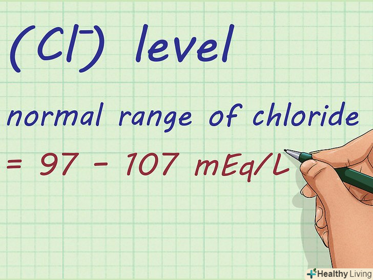 Визначте ваш рівень хлору (Cl⁻).Нормальний діапазон хлору між 97 - 107 мекв/л.рівень хлору ви також можете дізнатися, здавши аналізи.