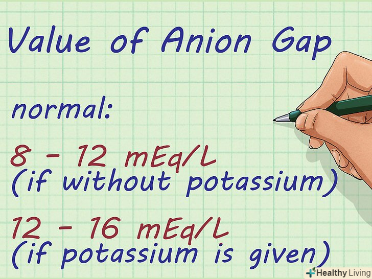 Дізнайтеся про значимість аніонного проміжку.це основний показник для пацієнтів з проблемами нирок і шлунково-кишкового тракту. Цей критерій не обов'язково вказує на якусь одну умову. Однак, вказує на закономірність деяких аспектів і звужує область пошуку.- Аніонний проміжок виявляє безпосередній зв'язок метаболічного ацидозу і нестандартного рівня pH у вашому організмі. Це диференціює причини метаболічного ацидозу і допомагає підтвердити результати інших досліджень. Попросіть свого лікаря допомогти вам розібратися.