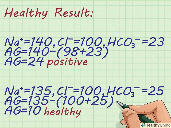 Знайте, що здоров'я-це результат.і повторимо, нормальне значення 8 - 12 мекв/л без калію, і 12 - 16 мекв/л з урахуванням калію.[1] ось вам два приклади:- Приклад 1: Na⁺ = 140, Cl - = 100, HCO₃⁻= 23