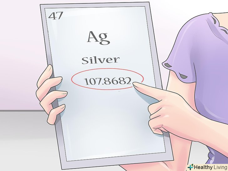 Знайдіть атомну масу в періодичній таблиці Менделєєва.у більшості стандартних таблиць Менделєєва містяться атомні маси (атомні ваги) кожного елемента. Як правило, вони наведені у вигляді числа в нижній частині комірки з елементом, під буквами, що позначають хімічний елемент. Зазвичай це не ціле число, а десятковий дріб.- Зверніть увагу, що всі відносні атомні маси, зазначені в таблиці Менделєєва, для кожного елемента єсередніми значеннями. У хімічних елементів є різні ізотопи - хімічні різновиди, що мають різні маси через додаткових або відсутніх нейтронів в атомному ядрі.[5] отже, відносні атомні маси, перераховані в періодичній таблиці, можуть використовуватися як середнє значення для атомів певного елемента, але Не як маса одного атома даного елемента.