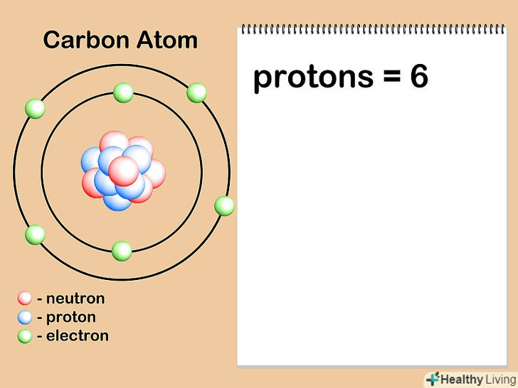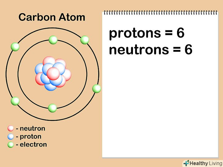 Знайдіть атомний номер даного елемента або його ізотопу.атомний номер-це кількість протонів в атомах елемента, воно ніколи не змінюється.[6] наприклад, всі атоми водню, причому тільки вони, мають один протон. Атомний номер натрію дорівнює 11, оскільки в його ядрі одинадцять протонів, тоді як атомний номер кисню становить вісім, так як в його ядрі вісім протонів. Ви можете знайти атомний номер будь – якого елемента в періодичній таблиці Менделєєва-практично у всіх її стандартних варіантах цей номер вказаний над літерним позначенням хімічного елемента. Атомний номер завжди є позитивним цілим числом.- Припустимо, нас цікавить атом вуглецю. В атомах вуглецю завжди шість протонів, тому ми знаємо, що його атомний номер дорівнює 6. Крім того, ми бачимо, що в періодичній системі, у верхній частині осередку з вуглецем (C) знаходиться цифра "6", що вказує на те, що атомний номер вуглецю дорівнює шести.