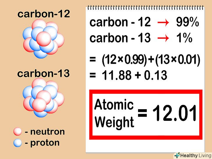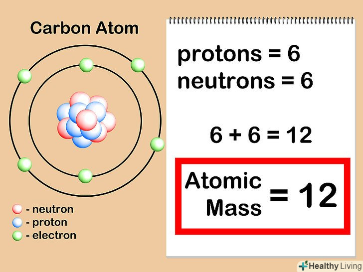 Складіть кількість протонів і нейтронів.це і буде атомною масою даного атома. Не звертайте уваги на кількість електронів, які оточують ядро - їх сумарна маса надзвичайно мала, тому вони практично не впливають на ваші розрахунки.- Наш атом вуглецю має 6 протонів + 6 нейтронів = 12. Таким чином, атомна маса даного атома вуглецю дорівнює 12. Якби це був ізотоп "вуглець-13", то ми б знали, що у нього є 6 протонів + 7 нейтронів = атомна маса 13.