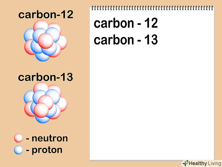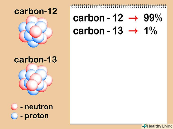 - Припустимо, що цікавить нас атом вуглецю має шість нейтронів (12C). Це найбільш поширений ізотоп вуглецю, що налічує близько 99% всіх атомів даного елемента.[7] однак близько 1% атомів вуглецю мають 7 нейтронів (13C). Інші види атомів вуглецю мають більше 7 або менше 6 нейтронів і існують в дуже малих кількостях.