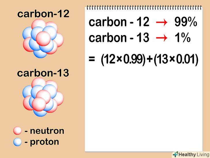 Помножте атомну масу кожного ізотопу на його концентрацію в зразку.помножте атомну масу кожного ізотопу на його процентний вміст (виражене у вигляді десяткового дробу). Щоб перевести відсотки в десятковий дріб, просто розділіть їх на 100. Отримані концентрації в сумі завжди повинні давати 1.- Наш зразок містить вуглець-12 і вуглець-13. Якщо вуглець - 12 становить 99% зразка, а вуглець-13 – 1%, то необхідно помножити 12 (атомна маса вуглецю-12) на 0,99 і 13 (атомна маса вуглецю-13) на 0,01.