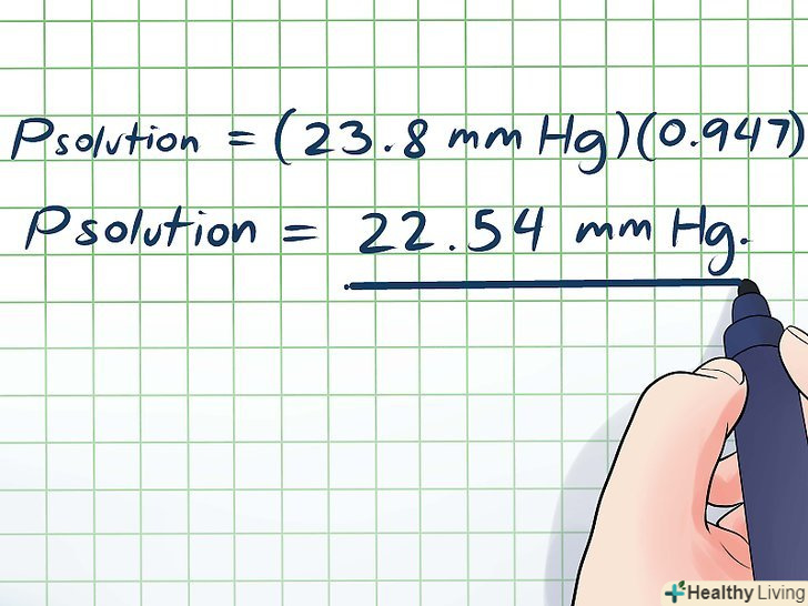Тепер підставте дані і знайдені значення величин в рівняння Рауля, наведене на початку цього розділу (Pрозчин = PрозчинникXрозчинник ).- У нашому прикладі: