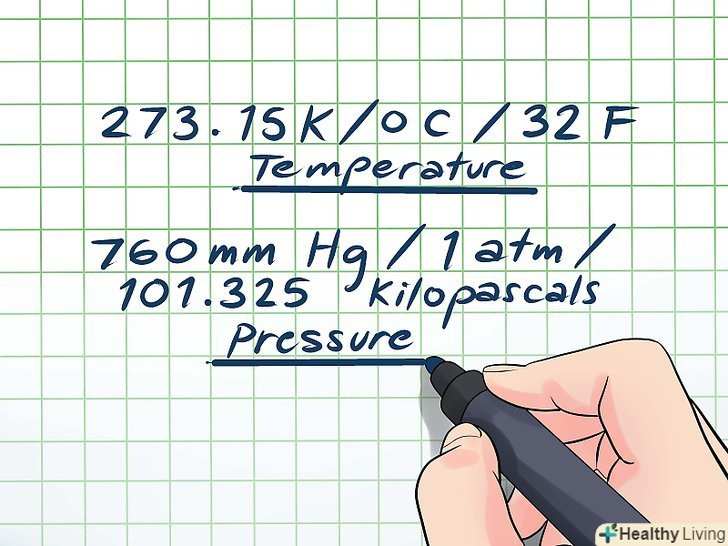 Визначення стандартних умов.найчастіше в хімії використовуються значення температури і тиску як свого роду значення «за замовчуванням». Такі значення називаються стандартними температурою і тиском (або стандартними умовами). У завданнях на тиск пари часто згадуються стандартні умови, тому краще запам'ятати стандартні значення:[9]- Температура: 273,15 K / 0C / 32 F