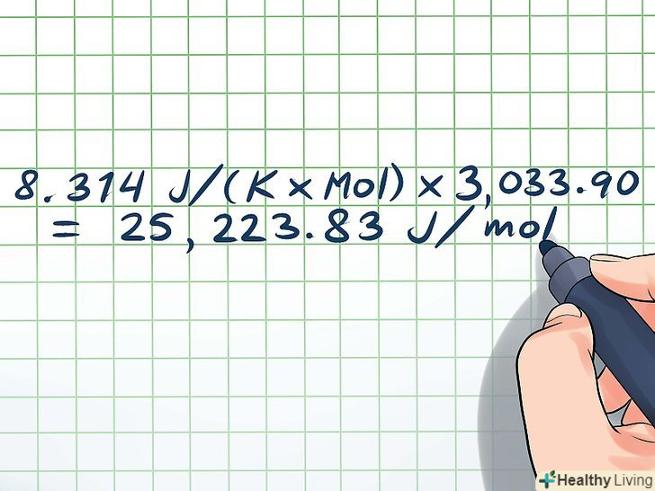 Підставте константи. рівняння Клапейрона-Клаузіуса містить дві константи: R і ΔHvap. R завжди дорівнює 8,314 Дж/(К×моль). Значення ΔHvap (ентальпія випаровування) залежить від речовини, тиск парів якого ви намагаєтеся знайти; цю константу, як правило, можна знайти в таблиці в підручниках з хімії або на сайтах (наприклад, здесь).[4]- У нашому прикладі припустимо, що в посудині знаходиться вода. ΔHvap води дорівнює 40,65 кДж/моль або дорівнює 40650 Дж / моль.