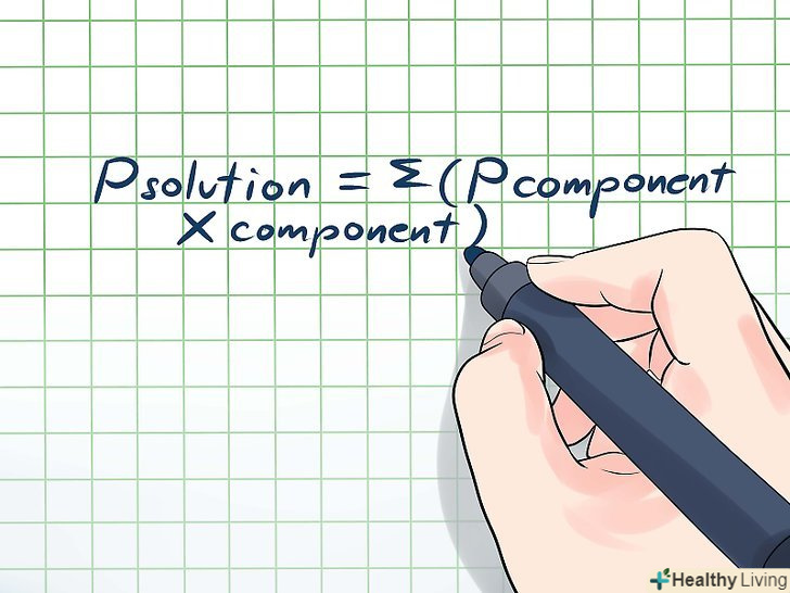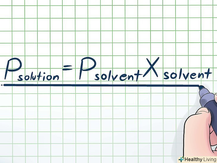 Запишіть закон Рауля.у реальному житті чисті рідини зустрічаються рідко; найчастіше ми маємо справу з розчинами. Розчин виходить при додаванні невеликої кількості певної хімічної речовини, званого "розчинена речовина«, в більшу кількість іншої хімічної речовини, званого»розчинник". У випадках розчинів користуйтеся законом Рауля:[5]Pрозчин = Pрозчинник X розчинник , де:- Pрозчин - тиск парів розчину.