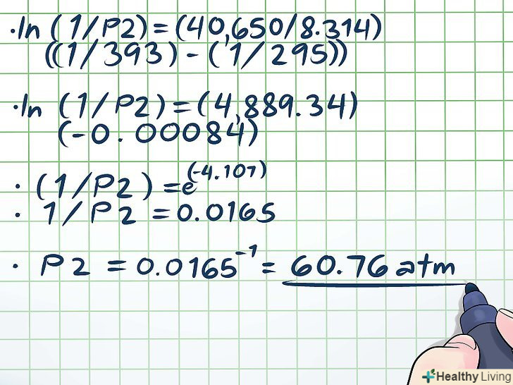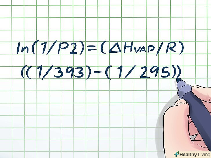 Підставте в рівняння Клапейрона-Клаузіуса дані вам значення величин.у більшості завдань даються два значення температури і значення тиску або два значення тиску і значення температури.- Наприклад, в посудині знаходиться рідина при температурі 295 К, а тиск її парів дорівнює 1 атмосфері (1 атм). Знайдіть тиск парів при температурі 393 K. тут вам дані два значення температури і значення тиску, тому ви можете знайти інше значення тиску за допомогою рівняння Клапейрона-Клаузіуса. Підставивши дані вам значення в формулу, ви отримаєте:Ln(1/P2) = (ΔHvap / R)((1/393) - (1/295)).