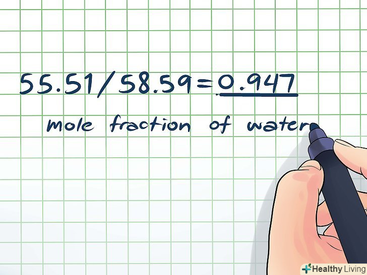 Знайдіть мольну частку розчинника.для цього знайдіть відношення числа молей речовини до загального числа молей всіх речовин, наявних в розчині. Іншими словами, мольна частка кожної речовини дорівнює (число молей речовини)/(загальне число молей всіх речовин).- Припустимо, що для приготування сиропу ви використовували 1 л води і 1 л сахарози (цукру). В цьому випадку необхідно знайти число молей кожної речовини. Для цього потрібно знайти масу кожної речовини, а потім використовувати молярні маси цих речовин, щоб отримати молі.