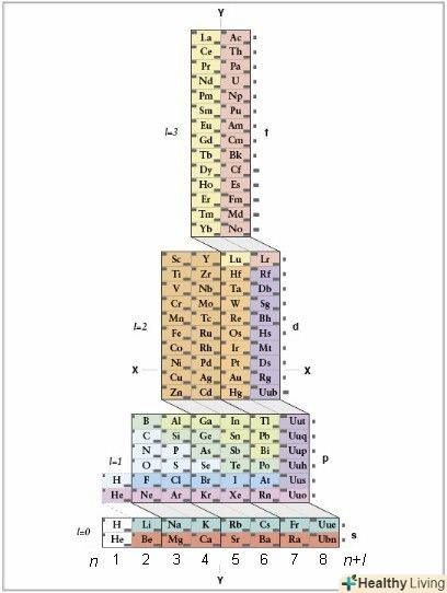 Освойте періодичну таблицю ADOMAH.даний метод запису електронної конфігурації не вимагає запам'ятовування, проте вимагає наявності переробленої періодичної таблиці, оскільки в традиційній таблиці Менделєєва, починаючи з четвертого періоду, номер періоду не відповідає електронній оболонці. Знайдіть періодичну таблицю ADOMAH-особливий тип періодичної таблиці, розроблений вченим Валерієм Циммерманом. Її легко знайти за допомогою короткого пошуку в Інтернеті.[2]- У періодичній таблиці ADOMAH горизонтальні ряди представляють групи елементів, такі як галогени, інертні гази, лужні метали, лужноземельні метали і т.д. вертикальні колонки відповідають електронним рівням, а так звані "каскади" (діагональні лінії, що з'єднують блоки s,p,d і f) відповідають періодам.