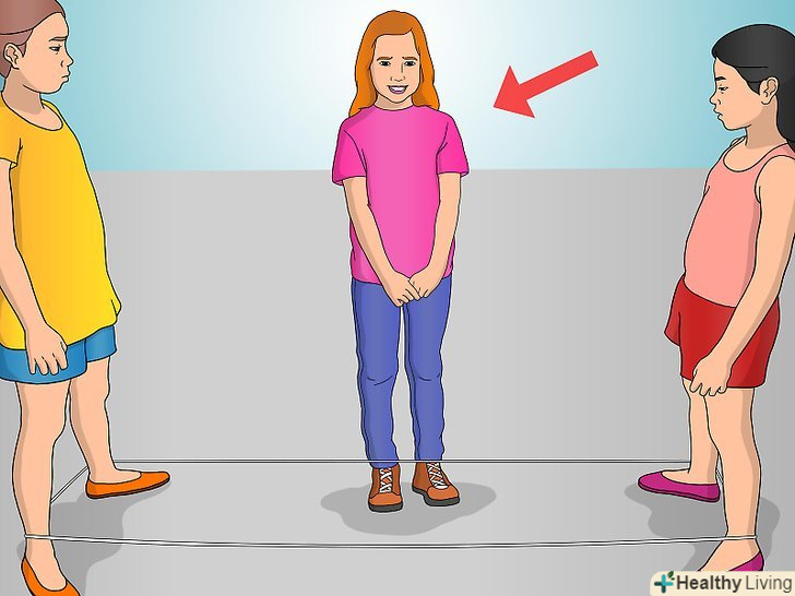 Третя людина посередині-це стрибун і повинен слідувати цьому прикладу починаючи з обох ніг всередині гумки:- Вистрибніть обома ногами