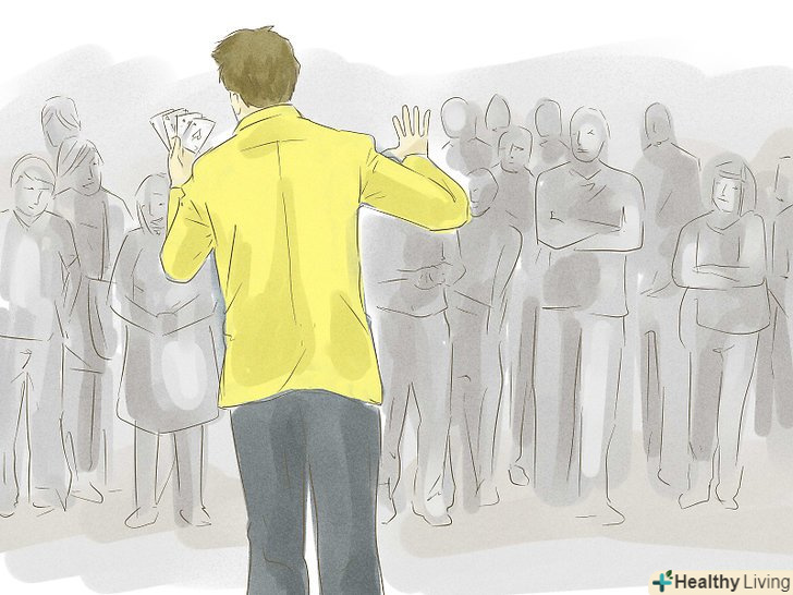 Відточуйте ваш виступ.Пам'ятайте, що магія орієнтована на людей, тому вам будуть потрібні вміння для роботи з ними. Розвивайте ваш стиль, практикуйтеся на вулиці, відзначте, які історії привертають або відштовхують увагу. Задавайте вашим волонтерам базові питання, запитаєте, як їх звуть, говорите голосно і впевнено для того, щоб залучити великий натовп. Пам'ятайте, що вулична магія, це шоу.- Зверніть увагу на ваш одяг і зовнішній вигляд. Деякі маги, особливо ті, які виступають для дітей, носять екстравагантні костюми. Більшість вуличних магів воліє добре одягатися, але в той же час і не відрізняться від людей на вулиці.