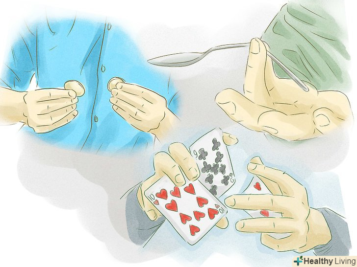 - Монета є простим і традиційним об'єктом для вправ на спритність рук, але ви повинні використовувати різні об'єкти. Примусьте зникнути годинник когось із аудиторії або практикуйтеся в інших трюках, які вимагають спритності рук, такий як зникнення карти.