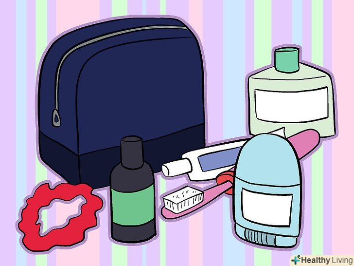 Знайдіть косметичку. у неї упакуйте: дезодорант, спрей для тіла, парфуми, зубну щітку / пасту, косметику, прокладки / тампони, шампунь, гель для душу (якщо ви плануєте прийняти душ в будинку друга), Гумки для волосся, шпильки, засіб для вмивання і інше, що хочете принести (покладіть все, що може протекти в пакети із застібкою або пластикові мішечки, щоб запобігти текти).