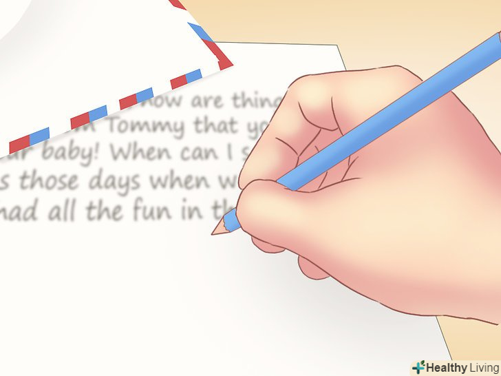 Напишіть листа.хоча багато хто вважає написання листів старомодним заняттям, насправді, багатьом дуже приємно отримати справжній лист, який можна потримати в руках. Письмо-це те, що людина може зберегти назавжди, як пам'ять про ваші стосунки. Воно не повинно бути формальним або стилістично правильним. Просто напишіть щось важливе для людини, якій ви пишете.[17]- Ви можете написати листа другу, знайомому або члену сім'ї.