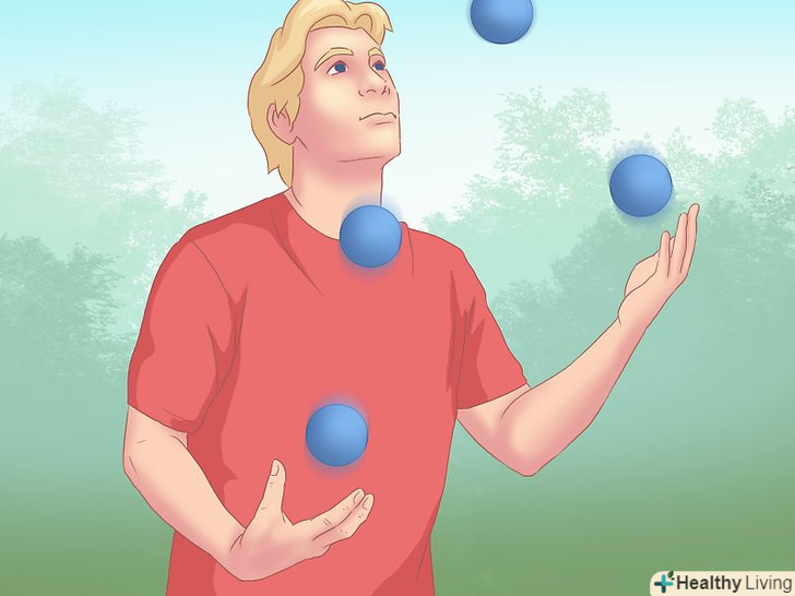 Навчіться жонглювати.візьміть три яблука, груші, кульки або подібних предметів, якими ви зможете жонглювати. Після того, як ви освоїте жонглювання трьома предметами, ви можете додати ще один. Експериментуйте, задіюючи ноги або спину.