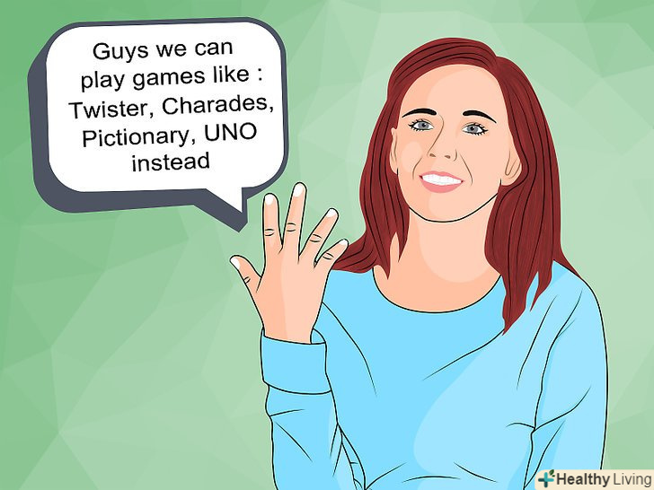 Запропонуйте зіграти в іншу гру.є багато різних веселих ігор, в які можна зіграти всім разом. Деякі з гравців, можливо, підтримають вас і захочуть зіграти в них більше, ніж в «7 хвилин в раю». Наприклад, зіграйте в твістер, шаради, pictionary, Уно та інші.[15]- Можна запропонувати Ігри, які, як вам здається, сподобаються іншим. Якщо інші гравці теж зацікавляться, у вас є шанс пограти всім разом в іншу гру.