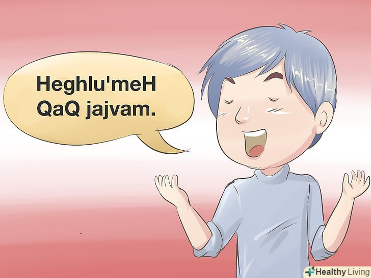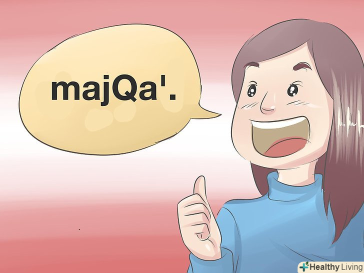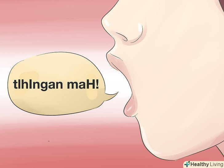 Ви повинні правильно вимовляти звуки Клінгонською мовою.[1] у ньому переважають вибухові (смичні) і гортанні звуки. У кожного звуку свій власний специфічний спосіб вимови, і ви повинні навчитися вимовляти їх правильно, перш ніж почнете говорити слова.- Звуки, написані малими літерами " b ", "ch", "j", "l", "m", "n", "p", "t", "v" і " w " вимовляються на клінгонському так само, як по-англійськи.