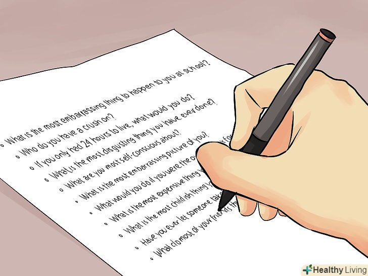 Складіть список питань.кожна людина повинна скласти свої питання перед початком гри. Не завжди по ходу гри легко скласти питання або придумати бажання. Ви можете скласти схожі питання:[3]- Яка незручна ситуація сталася з вами в школі?