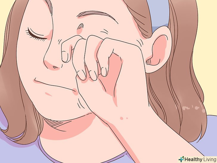 Потріть очі.Закрийте очі і акуратно потріть повіки протягом приблизно 25 секунд, потім відкрийте очі і подивіться на щось, не відриваючи погляд, поки не почнуть литися сльози. Для цього може знадобитися трохи практики, але як тільки у вас почне виходити, цей процес буде творити чудеса. При терті зона навколо очей теж почервоніє, проте не тріть занадто сильно, інакше ви можете травмувати слизову оболонку ока.[2]- Злегка доторкніться вказівним пальцем до одного з зіниць. Це викличе подразнення очей і може привести до появи сліз. Однак будьте обережні, щоб не ткнути пальцем в око.