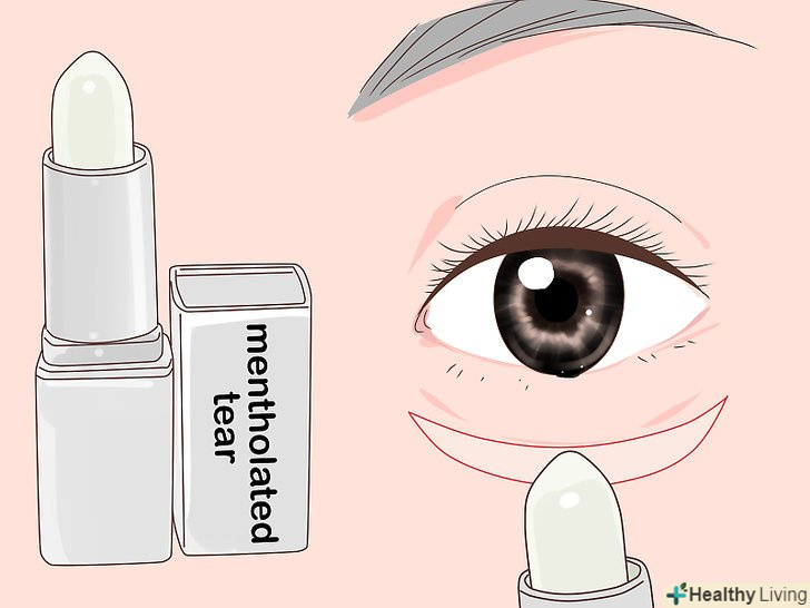 Нанесіть під очі речовину, що викликає сльози.скопіюйте голлівудських зірок і акуратно потріть під очима ментоловим олівцем для сліз. Може виникнути печіння, проте все повинно виглядати дуже реалістично. Проте, будьте дуже обережні, щоб навіть трохи кошти не потрапило в очі.[4]- Можна також використовувати очні краплі, щоб обличчя виглядало заплаканим. Просто капніть їх прямо під куточком очей, щоб вони правдоподібно котилися вниз по вашому обличчю.