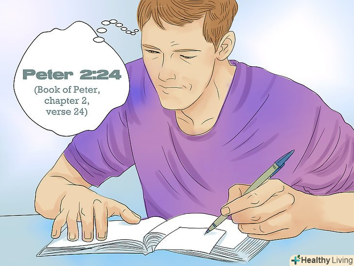 Запам'ятайте місцезнаходження вірша.якщо ви хочете цитувати вірші з Біблії, то важливо також пам'ятати їх місцезнаходження. Вам будуть потрібні особливі навички, щоб цитувати Біблію, але без точних посилань Ваші знання будуть неповними.[18]- Запишіть місцезнаходження вірша на аркуші паперу-наприклад, короткий запис "1 Петра 2: 24" означатиме Перше послання Петра, Глава 2, вірш 24.