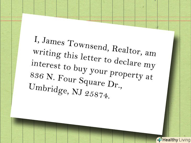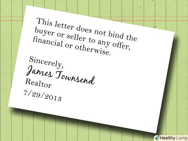 Лист про намір для дому (Letter of interest або Letter of intent) відправляється на ранніх стадіях угоди з нерухомістю. У цьому листі потенційний покупець викладає свої пропозиції для створення робочої основи подальших переговорів з продавцем. Ці листи найчастіше використовується при покупці будинку, але також можуть мати місце в разі лізингу або оренди. Почніть з кроку 1, щоб дізнатися, як написати лист про намір для дому, які типи інформації включити (і які не включати), і як забезпечити, щоб ваш лист не був юридично зобов'язуючим.