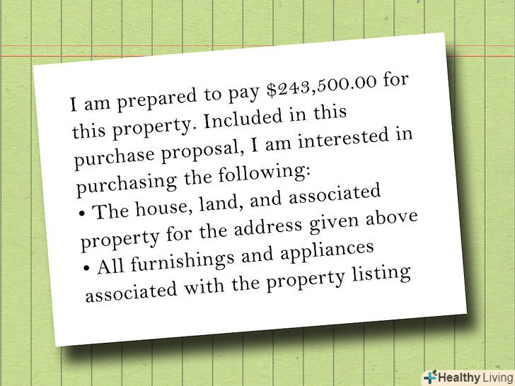 Запропонуйте депозит або передоплату за майно.{{#txtscrl:Propose a deposit or down payment|Blue Horizon Real EstateJames Townsend, Realtor4857 W. Circle Dr., Parliament, NJ 24578Phone: (555) 555-0198 Email: [email protected] whom it may concern:I, James Townsend, Realtor, am writing this letter to declare my interest to buy your property at 836 N. Four Square Dr., Umbridge, NJ 25874. I am prepared to pay $243,500.00 for this property. Included in this purchase proposal, I am interested in purchasing the following: • The house, land, and associated property for the address given above • All furnishings and appliances associated with the property listing|I propose an initial deposit of $25,000 as an act of good faith. I would like to make the deposit two weeks from the time of the agreement. }}- Це буде служити в якості демонстрації вашої сумлінності, на випадок якщо продавець погодиться на вашу пропозицію. Типовий депозит становить 10 відсотків від загальної вартості або орендна плата за два місяці.