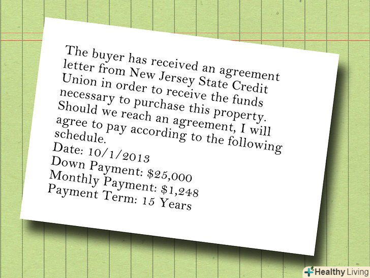 Вкажіть, як і коли ви маєте намір оплатити покупку будинку, вартість лізингу або оренди.{{#txtscrl:Indicate how and when you intend to pay|Blue Horizon Real EstateJames Townsend, Realtor4857 W. Circle Dr., Parliament, NJ 24578Phone: (555) 555-0198 Email: [email protected] whom it may concern:I, James Townsend, Realtor, am writing this letter to declare my interest to buy your property at 836 N. Four Square Dr., Umbridge, NJ 25874. I am prepared to pay $243,500.00 for this property. Included in this purchase proposal, I am interested in purchasing the following: • The house, land, and associated property for the address given above • All furnishings and appliances associated with the property listingI propose an initial deposit of $25,000 as an act of good faith. I would like to make the deposit two weeks from the time of the agreement.|The buyer has received an agreement letter from New Jersey State Credit Union in order to receive the funds necessary to purchase this property. Should we reach an agreement, I will agree to pay according to the following schedule. Date: 10/1/2013Down Payment: $25,000Monthly Payment: $1,248Payment Term: 15 Years }}- Замість того щоб встановлювати конкретну дату, використовуйте таку термінологію як " два тижні з моменту укладення угоди."Включіть детальну інформацію про брокерів з нерухомості або агентів, банків або кредиторів, з якими ви будете працювати, і як плануєте платити-однією великою сумою або частинами.