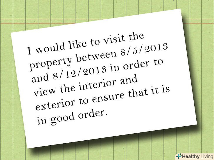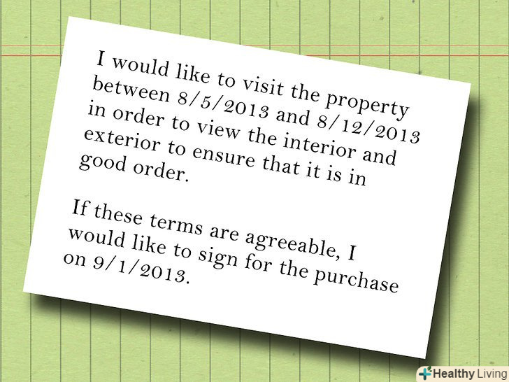 Запропонуйте короткий період часу, протягом якого ви зможете оглянути майно.{{#txtscrl:Arrange a time to inspect the property|Blue Horizon Real EstateJames Townsend, Realtor4857 W. Circle Dr., Parliament, NJ 24578Phone: (555) 555-0198 Email: [email protected] whom it may concern:I, James Townsend, Realtor, am writing this letter to declare my interest to buy your property at 836 N. Four Square Dr., Umbridge, NJ 25874. I am prepared to pay $243,500.00 for this property. Included in this purchase proposal, I am interested in purchasing the following: • The house, land, and associated property for the address given above • All furnishings and appliances associated with the property listingI propose an initial deposit of $25,000 as an act of good faith. I would like to make the deposit two weeks from the time of the agreement.The buyer has received an agreement letter from New Jersey State Credit Union in order to receive the funds necessary to purchase this property. Should we reach an agreement, I will agree to pay according to the following schedule. Date: 10/1/2013Down Payment: $25,000Monthly Payment: $1,248Payment Term: 15 Years|I would like to visit the property between 8/5/2013 and 8/12/2013 in order to view the interior and exterior to ensure that it is in good order.}}- Будьте конкретні, говорячи про природу вашої інспекції, наприклад, просте відвідування або дослідження податкових чи інших записів.