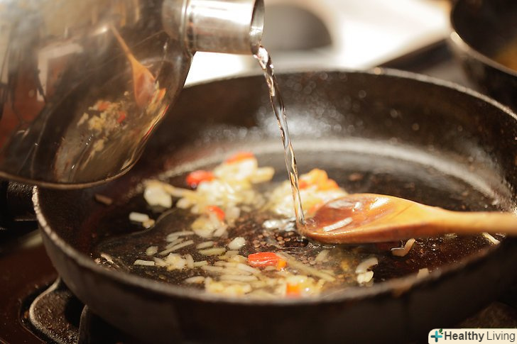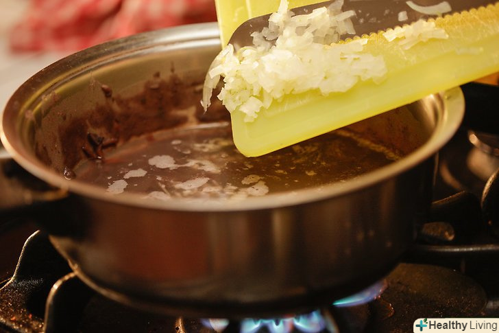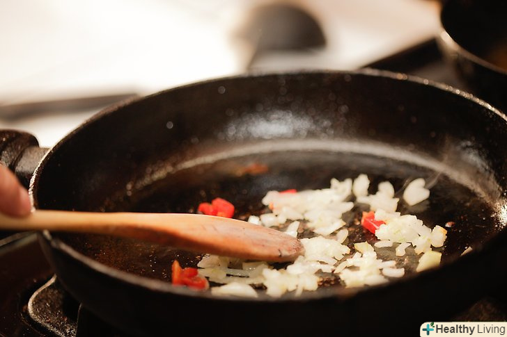 - Налийте масло в чавунну сковороду або каструлю. Додайте нарізану цибулю і обсмажте його.