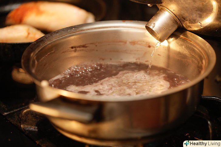 Злийте воду.ніколи не готуйте квасолю в тій воді, в якій вона була замочена, так як в ній містяться олігосахариди, які сприяють підвищеному газоутворення. Завжди зливайте воду, а для приготування використовуйте свіжу.- Також важливо не додавати приправи і сіль в готується квасоля. Це може змінити час приготування і зробити її жорсткою. Приправи додаються в уже готову квасолю Пінто.