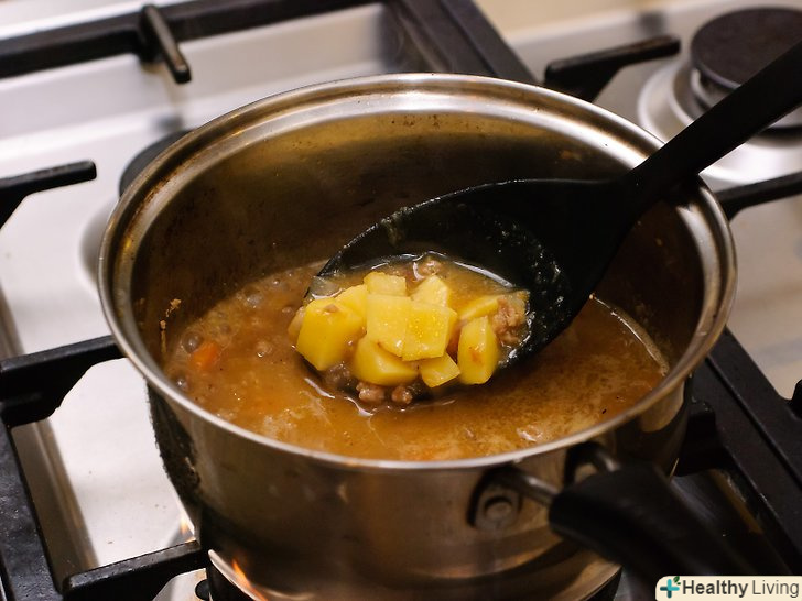 Перемішайте картоплю і тушкуйте.додайте очищену і нарізану картоплю в каструлю і перемішайте, щоб рівномірно розподілити її. Продовжуйте тушкувати каррі на слабкому вогні протягом 1 години, або поки м'ясо і картопля не стануть ніжними, і рідина каррі дуже густий.- Витратьте цілу годину, якщо ви готуєте каррі з яловичиною або свининою. Якщо каррі з куркою, ви повинні будете гасити її тільки 30-45 хвилин, щоб врятувати курку від перетравлення і висихання.