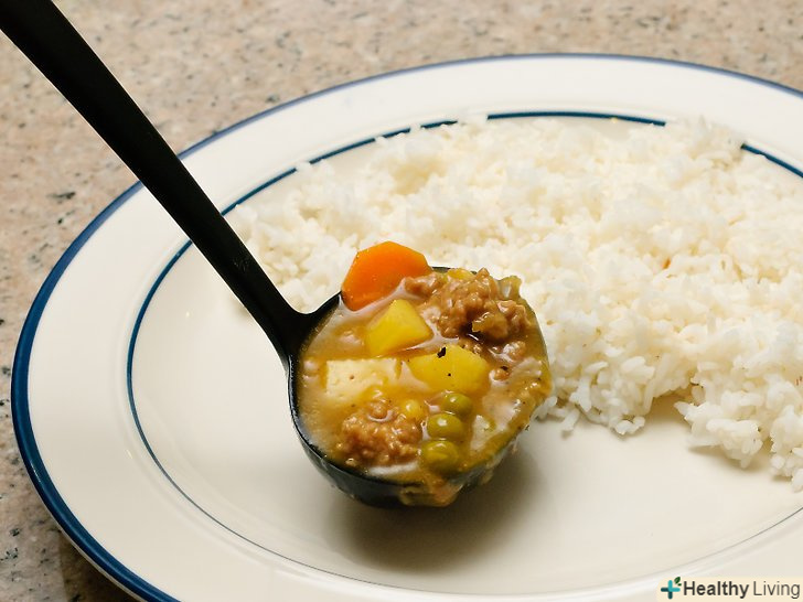 Подавайте.розкладіть Каррі в окремі страви. Подають її з білим або коричневим рисом. При бажанні прикрасьте дрібно нарізаним фукуджинзуке або раккую.- Традиційно, каррі по-японськи подається одним з двох способів: ви можете покласти соус каррі в окрему піалу і подати до неї окрему страву з рису або ви можете викласти рис на блюдо і покрити половину порції з каррі.[4]