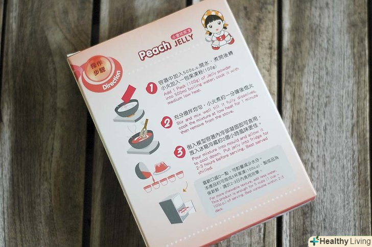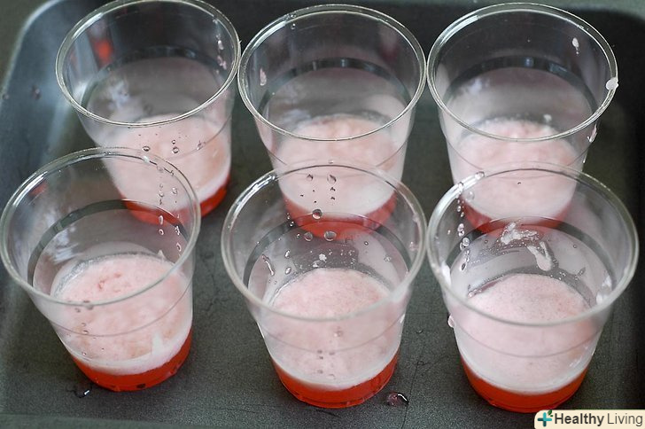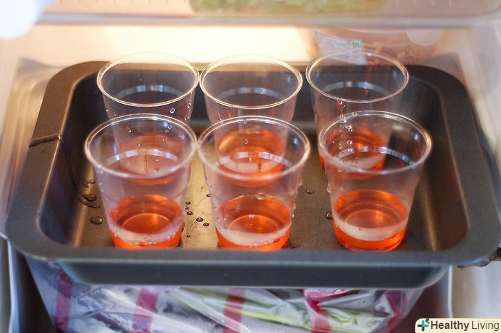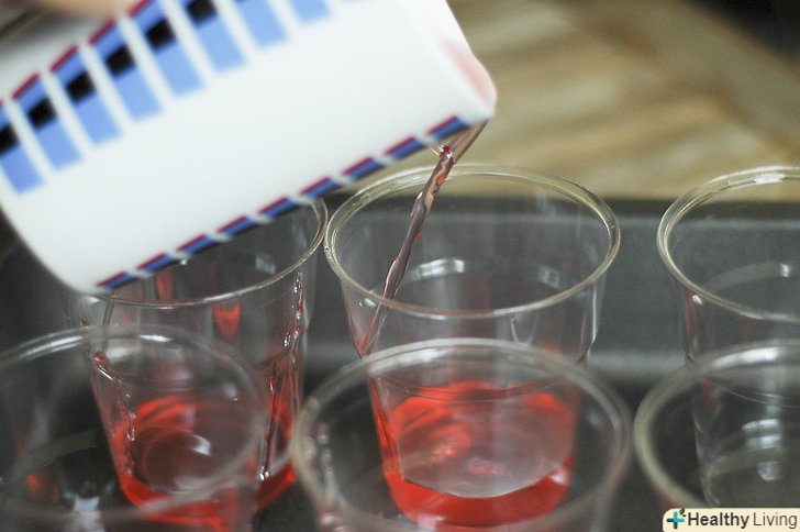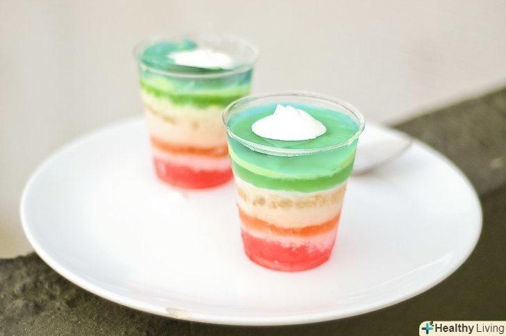 Приготуйте першу порцію желе так, як написано на упаковці. для ефекту веселки, почніть з червоного кольору і йдіть по всьому колірному спектру веселки. Ви можете зробити і навпаки: почніть з фіолетового желе і рухайтеся в зворотному порядку.- Ви можете так само скористатися методом швидкого охолодження за допомогою кубиків льоду, якщо це передбачено інструкцією до Вашого желе.