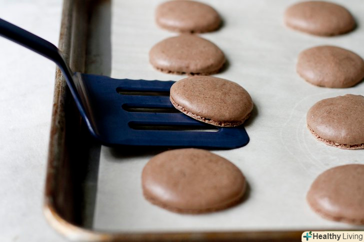 Переверніть половинки печива.лопаткою акуратно переверніть охолоджене печиво, щоб зверху була плоска сторона. Мигдальне печиво дуже легко зламати, тому будьте гранично обережні.- Щоб допомогти мигдалевій печінці швидше охолонути, Пекар Ерік Ланлард рекомендує підняти пергаментний папір і налити трохи холодної води на деко. Це створить пар, а вам буде легше зняти печиво з пергаментного паперу.