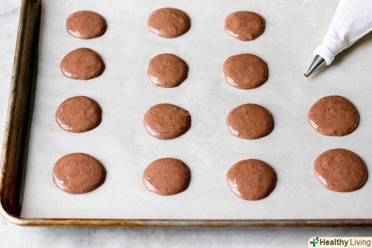 Видавіть тісто на деко.стискайте кондитерський мішок і видавлюйте гуртки тіста, приблизно по 7 сантиметрів. Тісто буде злегка розтікатися, тому залишайте простір між печивом. Постарайтеся видавлювати однакові половинки печива. Тепер підніміть деко з печивом над стільницею приблизно на 2 сантиметри і впустіть його. Повторіть три рази; це допомагає тесту осісти.