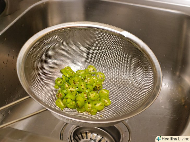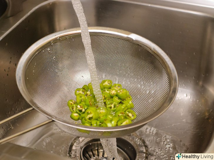 Злийте воду і промийте перець.після закінчення процесу замочування злийте воду з перцю через друшляк. Прополощіть халапеньо під проточною водою.