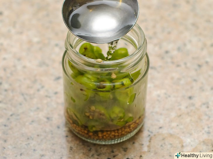 Розлийте розсіл по банках.ковшем розлийте розсіл по банках, повністю покриваючи халапеньо і заповнюючи будь-які повітряні кишеньки в банку. Чи не доливайте до краю банки приблизно 1,25 см.