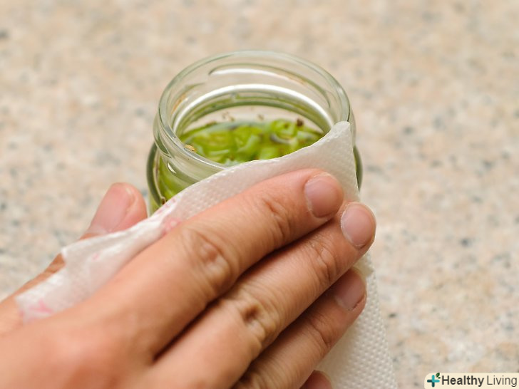 Насухо витріть краю банок.якщо що-небудь потрапило на краї банок, витріть їх чистою, вологою тканиною. Приправи або розсіл можуть вступити в реакцію з кришками і не дати їм щільно закритися.