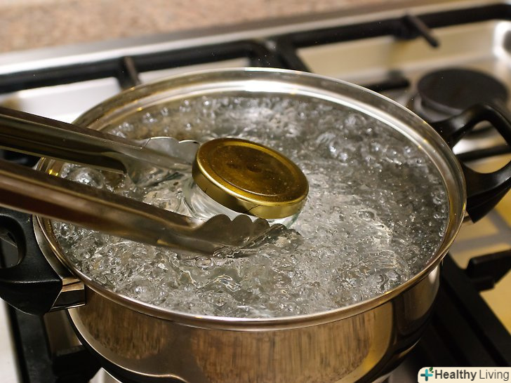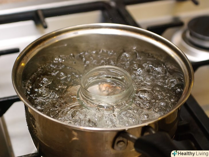 Стерилізують банки киплячою водою.Закип'ятіть велику каструлю води на плиті на сильному вогні. Як тільки вода закипить, акуратно помістіть банки в каструлю щипцями. Банки не повинні стикатися, так як це може привести до відколів або тріщин. Стерилізують банки в киплячій воді приблизно 10-15 хвилин, а потім акуратно дістаньте їх щипцями.